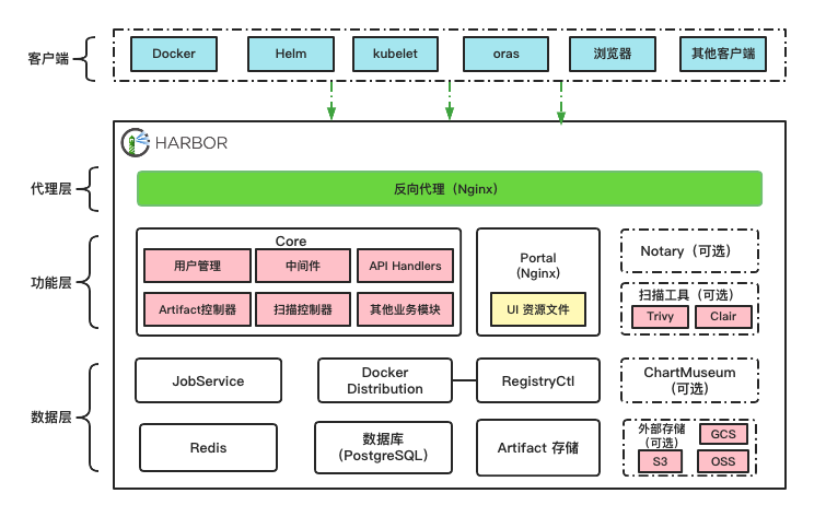 Harbor 是由 VMware 开源的一款云原生制品仓库Harbor 的核心功能是存储和管理 Artifact。Harbor 允许用户用命令行工具对容器镜像及其他 Artifact 进行推送和拉取,并提供了图形管理界面帮助用户查看和管理这些 Artifact。在 Harbor 2.0 版本中除容器镜像外Harbor 对符合 OCI 规范的 Helm Chart、CNAB、OPA Bundle 等都提供了更多的支持。